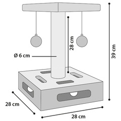 Material: felpa suave (267 g/m²) | Poste rascador con cuerda para rascador de sisal (5 mm) | Grosor placa base: 8 cm y diámetro poste rascadore: 6 cm | Plataforma de descanso acolchada | Caja con bolas en el interior para estimular mentalmente a su gato | Con juguetes con cascabel para gatos para que disfruten jugando