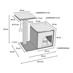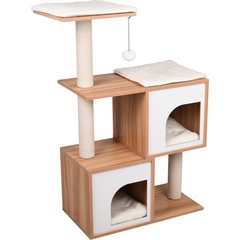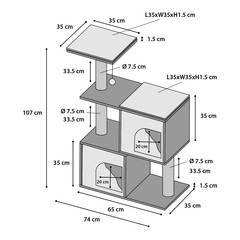 Material: tablero aglomerado | Poste rascador con cuerda para rascador de algodón (6 mm) | Grosor placa base: 1,5 cm y diámetro poste rascador: 7,5 cm | Plataformas de descanso y refugios | Los cojines extraíbles se sujetan con cierre de gancho y bucle | Los cojines están revestidos de felpa suave (280 g/m²) | Se sostiene sobre patas de goma y con juguete para que disfruten jugando