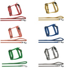 El conjunto Bright de arnés y correa para gatos está hecho de nylon y vienen en seis colores fuertes | Cuentan con costuras reflectantes | El arnés tiene un cierre de seguridad a presión y es ajustable continuamente | La entrega se ordena por color