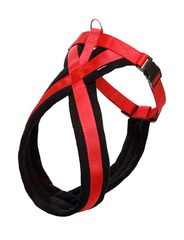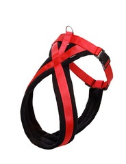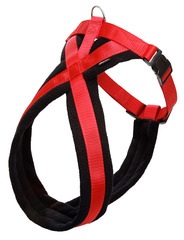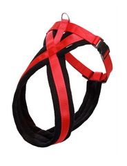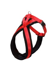 Arnés confortable para la vida cotidiana. Combinación de nylon y vellón. Robusto y fácil de cuidar I Asiento especialmente suave y cómodo. | regulable en progresión continua en el área del cuello | Disponible en negro y negro-rojo.
