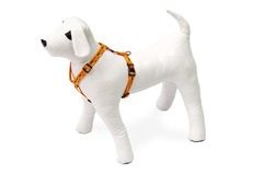 Hecho de material de nylon suave y robusto | Resistente, duradero y fácil de limpiar | Con dos hebillas para poner y quitar fácilmente | Los cinturones de pecho y cintura son ajustables continuamente | Hebilla de seguridad estable, con cierre de seguridad | Anillo en D resistente | Guarniciones en negro | En 8 colores básicos con motivos estampados | En 3 tamaños