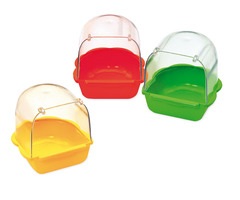 Para un baño agradable y divertido | De plástico | Fácil de limpiar | Dispositivo para colgar en la abertura de la puerta de la jaula. | Carcasa básica disponible en 3 colores. | La entrega se ordena por color. | La capucha transparente protege las áreas circundantes de las salpicaduras de agua. Posible colocación en el piso de la jaula