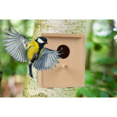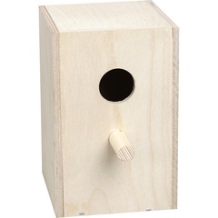 Material: madera | Apto para aves exóticas | Diámetro del orificio de entrada: 30 mm | Percha: 40 x 10 mm | Grosor de la pared: 8 mm | Techo abatible para facilitar la limpieza | Fácil de colgar gracias al orificio para colgar