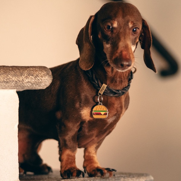 Chapa esmaltada a mano con opción de grabado en la cara posterior. Incluye la anilla para colgar en el collar o en un llavero. | Código MyFamily: CHBURGER