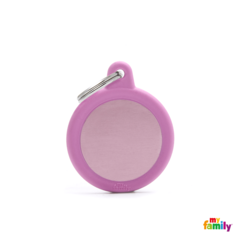 Chapa de aluminio anodizado y borde de goma, con opción de grabado por las dos caras. Incluye la anilla para colgar en el collar. Medidas: 3,7cm x 3cm. Grosor: 2mm | Equivalencia códigos: MF74397 = HTA04PINK