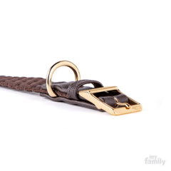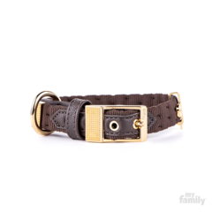Collar fabricado en nylon de primera calidad con acabados en baño de oro de 24K. Cuenta con una anilla en "D" para facilitar el anclaje a la correa y un porta placas para colgar la chapa identificativa. | Equivalencia con códigos MyFamily: (XXS) 1167 (XS) 1168 (S) 1111 (SM) 1112 (M) 1113 (ML) 1114 (L) 1115 (XL) 1116 (XXL) 1117 (XXXL) 1118.