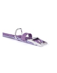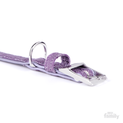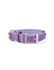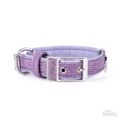 Collar fabricado en piel sintética de calidad con acabados en bronce blanco y esmalte lila con glitter. Cuenta con una anilla en "D" para facilitar el anclaje a la correa y un porta placas para colgar la chapa identificativa. | Equivalencia con códigos MyFamily: (XXXS) 1094 (XXS) 1095 (XS) 1100 (S) 1101 (SM) 1102 (M) 1103 (ML) 1391.
