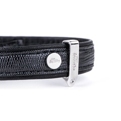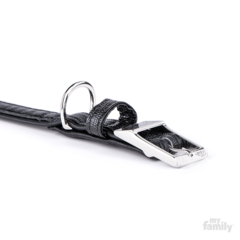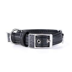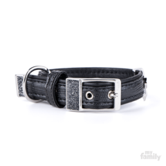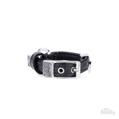 Collar fabricado en piel sintética de calidad con acabados en bronce blanco y esmalte negro con glitter. Cuenta con una anilla en "D" para facilitar el anclaje a la correa y un porta placas para colgar la chapa identificativa. | Equivalencia con códigos MyFamily: (XXXS) 1088 (XXS) 1089 (XS) 1090 (S) 1091 (SM) 1092 (M) 1093 (ML) 1390.
