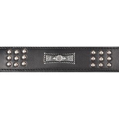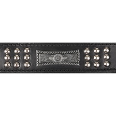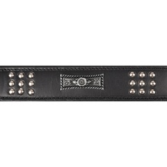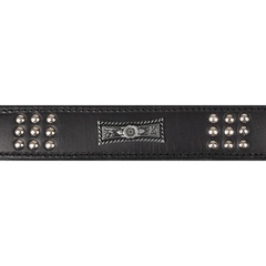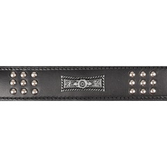 Material: cuero de búfalo con cuero de vacuno en el interior | Relleno: acetato de vinilo de etileno | La hebilla está cromada | Cuero engrasado cosido como refuerzo y forrado con cuero suave | Decorado con elementos decorativos y clavos