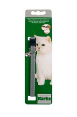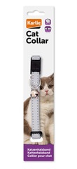 Este collar para gato plateado tiene un mecanismo de bloqueo rápido y seguro y es continuamente ajustable a la circunferencia del cuello del gato. EL cascabel asegura que los propietarios escuchen a su gato cuando está cerca. También advierte a las aves y otros pequeños animales salvajes del animal que se acerca cautelosamente. Los elementos reflectantes aumentan la visibilidad del gato y, por lo tanto, garantizan una mayor seguridad en la oscuridad.