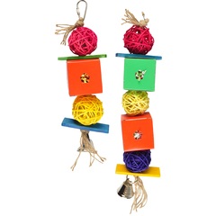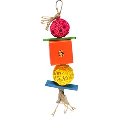Material: ratán, madera de pino, papel y sisal | Juguete colorido con bolas, cubos, cuentas y cuerdas para un sabroso mordisqueo | Relleno de papel para más diversión | Campanita tintineante para más diversión | Fácil de fijar con sistema de suspensión metálica | Los colores mostrados son indicativos y pueden diferir de la foto