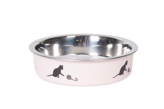 Comedero de acero inoxidable | Decorado con un lindo motivo de gato | Apto para lavavajillas | Suelo antideslizante | Retire el anillo de goma antes de lavar en el lavavajillas | Disponible en rosa o azul claro | Medidas: ø: 10cm | Capacidad: 160ml