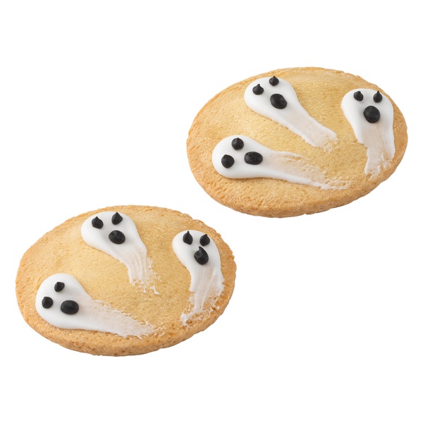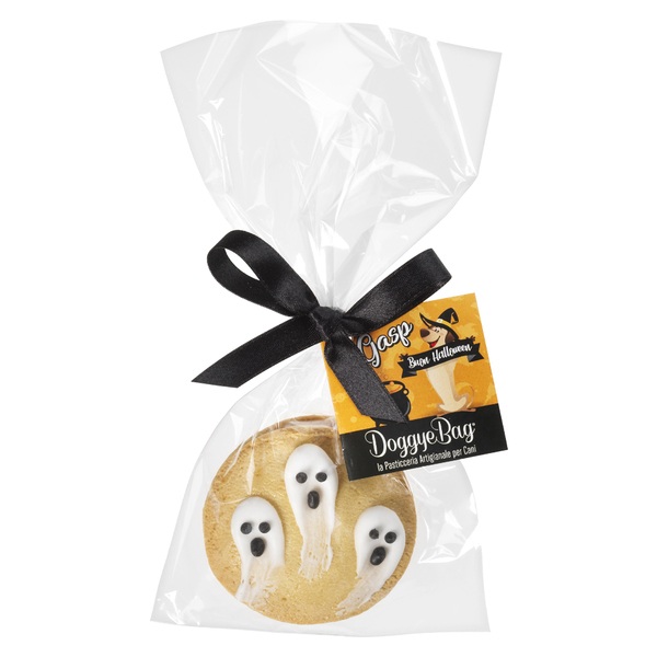 ¡¡¡Boo!!! ¿Se dejarán «asustar» nuestros amigos de cuatro patas por fantasmas espeluznantes? Dos deliciosas galletas para perros, hechas de galletas de mantequilla con glaseado de yogur. Presentadas en una bolsita transparente con un lazo de satén.