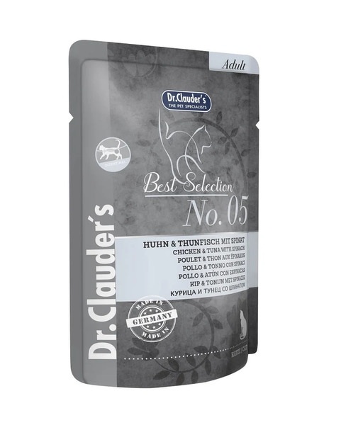 Alto contenido en carne de pollo y atún para una dieta rica en proteínas | El gamandro, una planta muy apreciada por los gatos, favorece la salud intestinal | Las espinacas fortalecen las células y refuerzan el sistema inmunitario y el metabolismo celular | El aceite de linaza ayuda a reducir la agresividad del ácido estomacal | El zinc favorece la regeneración y la cicatrización de heridas | Best Selection n.º 05 Pollo y atún con espinacas