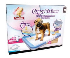 El Puppy Trainer fue desarrollado especialmente para apoyar la capacitación de los cachorros para ser entrenados en casa. Se utiliza en combinación con las esterillas de entrenamiento para cachorros. La esterilla absorbe la humedad y mantiene el ambiente seco y limpio. Se coloca en el entrenador de cachorros y se alienta al cachorro a hacer sus negocios allí. Para lograr un mejor resultado, el Spray de entrenamiento para cachorros también se puede rociar sobre la alfombra para que el perro joven pueda encontrar este lugar más fácilmente. La esterilla de entrenamiento se fija de forma segura en el Puppy Trainer para que no se mueva ni se rasgue. Un sistema de clic hace que cambiar las esterillas sea extremadamente fácil. Se absorbe la humedad y los olores desagradables y se protegen los pisos y el mobiliario. El paquete inicial contiene un entrenador de cachorros y diez esterillas s de entrenamiento para cachorros. Esteras de entrenamiento adicionales y el spray de entrenamiento Puppy están disponibles por separado.