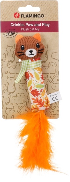 Material: felpa|Con sonido crepitante, hierba gatera y plumas para que disfruten más jugando|Medidas: 4,5x2,5x22,5CM