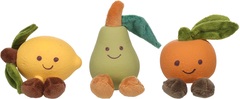 Material: látex |Acabado con felpa |Con sonido para que disfruten jugando |Dimensiones: 9cm L x 5.3cm An x 11.5cm Al | Color: Naranja, Verde, Marrón, Verde, Verde oscuro, Marrón, Amarillo, Verde, Marrón | Figuras: Naranja, Pera, Limón