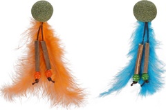 Juguete interactivo que combina una pelota en colores surtidos (naranja y azul) con plumas. Es un juguete divertido y entretenido que ayuda a mantener a los gatos activos y enérgicos. Es resistente y está hecha de materiales seguros para que los gatos puedan jugar y morder sin dañar sus dientes. Además, su tamaño es perfecto para que los gatos puedan jugar y perseguir la pelota fácilmente. Diseñado para que los gatos puedan masticar y disfrutar de la hierba, lo que ayuda a mantener su sistema digestivo sano. La hierba también proporciona una fuente natural de vitaminas y minerales que son importantes para la salud de los gatos. Las plumas que sobresalen de la pelota atraen la atención de los gatos y despiertan su instinto cazador, lo que los hace perseguir y jugar con el juguete con mayor entusiasmo.
