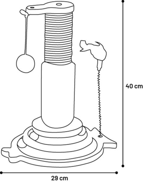 Material: madera|Poste rascador con cuerda para rascador de cáñamo (3 mm)|Con una pelotita de sisal y un muelle con plumas para que disfruten jugando|Pista de bolas con bolas de hierba gatera y bolas de madera en el interior para estimular mentalmente a su gato|El cepillo de goma proporciona a tu gato un maravilloso masaje|Medidas: 29x26x40CM