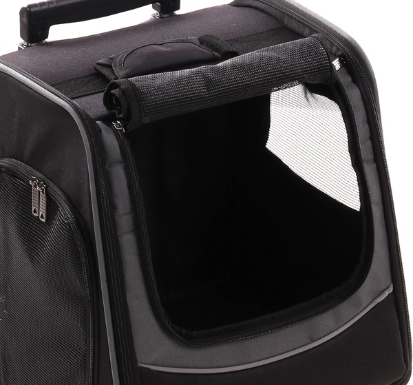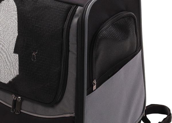 Material: poliéster con relleno: espuma para mantener la forma|Se puede limpiar con paño húmedo, con asa extensible y 2 ruedas|Bastidor y parte trasera reforzados con tiras reflectantes|Aberturas con cremallera en delantero e lateral|Base extraíble con cremallera y funda extraíble y lavable a 30°C|Cinturón ajustado con mosquetón & bucles para cinturón de seguridad|3 en 1: mochila/bolsa de transporte con correas de hombro ajustables/asa