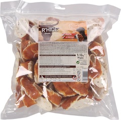 Pienso complementario para perros. No apto para consumo humano. Proporciónele siempre agua potable. No ponga en la comida el desoxidante de la bolsa. Tiempo de consumo limitado después de la apertura | Composición: Piel de vacuno (58,45%), pollo (38,25%), glicerina (1,5%), sorbitol (1,5%), sal (0,3%)