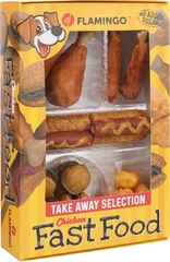 ¡Consiente a tu perro con nuestra caja de comida rápida para llevar! ¡Llena de deliciosos bocadillos como nuggets, tempura y mini hamburguesas. Sin azúcares añadidos, ¡pura diversión para tu perro!