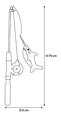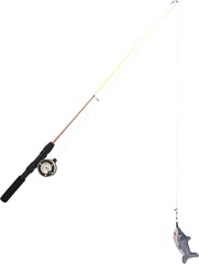 Caña de pescar diseñada para que los gatos se diviertan y se mantengan activos. La caña de pescar está compuesta por una varilla de plástico resistente, con un peluche de poliéster suave en la parte final que representa la forma de un tiburón gris. La varilla de plástico es lo suficientemente resistente como para soportar el movimiento y las sacudidas de los gatos mientras juegan con el peluche del tiburón. El diseño del tiburón puede ser atractivo para los gatos y estimular su instinto de caza, ya que pueden ver al juguete como una presa potencial. El movimiento de la caña de pescar puede ayudar a simular el movimiento de una presa, lo que puede hacer que el gato se sienta más interesado y motivado para jugar.