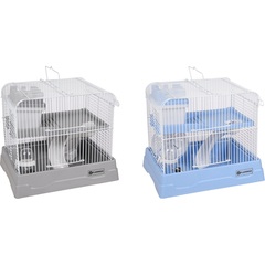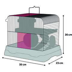 Material: metal y plástico |Adecuado para roedores pequeños como hámsters, ratones y jerbos |Incluye bebedero, plataforma, rampa, rueda para correr, refugio y comedero |2 puertas con sistema de clic en la parte delantera y superior |Parte superior extraíble |Grosor horizontal, vertical y distancia entre los alambres: 2 / 2 / 8 mm |Con asa para facilitar el transporte