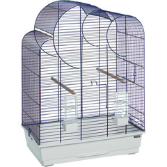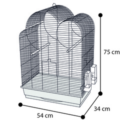 Material: metal con recubrimiento en polvo | 2 perchas de madera y 2 comederos/bebederos extraíbles | Dimensiones perchas: 16 x 345 mm | 2 puertas batientes: 1 puerta batiente delantera y 1 puerta batiente lateral | Con bandeja de plástico extraíble para facilitar la limpieza de la jaula | Grosor horizontal, vertical y distancia entre los alambres: 1,6 / 3 / 10 mm
