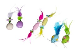 Ratones de colores | Hechos de felpa suave con colas de plumas. | Para retozar y jugar | Colores surtidos en tarjeta | Con hierba gatera