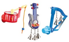 Proporciona a las aves una variada actividad y entretenimiento. 3 instrumentos musicales | De plástico | Con campanas, bolas, cintas o espejos. Entrega ordenada por color