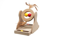 El juguete del gato Tumbler asegura el movimiento y la carga de trabajo mental. Varios elementos animan al gato a jugar y satisfacen la necesidad natural de rascarse y jugar. Una superficie de raspador de sisal, bolas de madera móviles, una rueda giratoria en el centro del marco de madera y las plumas adjuntas ofrecen una variedad de alternativas de juego y evitan el aburrimiento.