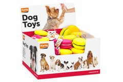 Juguete colorido para perro | hecho de vinilo | En forma de macarrones deliciosos | Ideal para tirar, atrapar y recuperar | 3 colores diferentes | 64 piezas en tarjeta