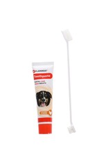 Set con pasta de dientes y cepillo doble cara | Asegura la higiene bucal | Fortalece los dientes y protege contra las caries | Reduce el riesgo de placa bacteriana | Pasta de dientes con sabor a pollo | Con cerdas suaves que evitan el daño a las encías | El cepillo de dientes es adecuado para todas las razas de perro | Contenido pasta de dientes: 85g | Código Flamingo: 521236