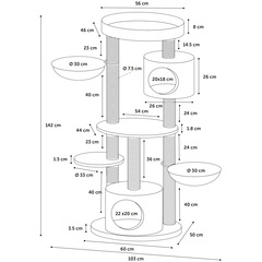 Material: felpa suave (450 g/m²) | Poste rascador con cuerda para rascador de sisal (6 mm) | Grosor placa base: 3,5 cm y diámetro poste rascadore: 7,5 cm | Hamacas, plataformas de descanso y refugios | Refugios y plataformas de descanso están revestidos por dentro y por debajo | Cojines extraíbles