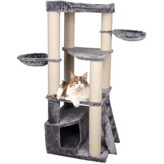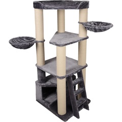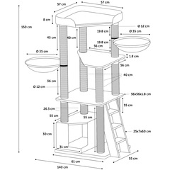 Material: felpa suave (450 g/m²) | Poste rascador con cuerda para rascador de algodón (6 mm) | Grosor placa base: 3,5 cm y diámetro poste rascadore: 12 cm | Hamacas, plataformas de descanso y refugio acolchado | El refugio y las plataformas de descanso están revestidos por dentro y por debajo | Cojín acolchado extraíble | El cojín tiene una funda extraíble con cremallera