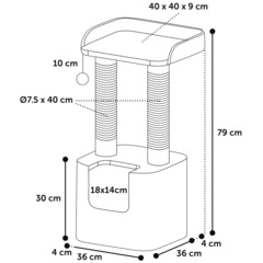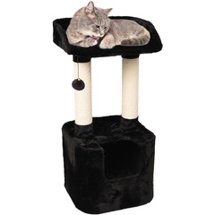 Material: felpa suave (267 g/m²) | Poste rascador con cuerda para rascador de algodón (6 mm) | Diámetro poste rascador: 7,5 cm | Plataforma de descanso acolchada y refugio acolchado | El refugio y la plataforma de descanso están revestidos por dentro y por debajo | Con juguete con cascabel para gatos para que disfruten jugando