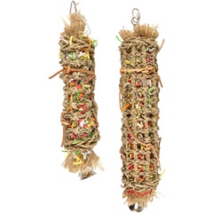 Material: hierba marina, papel, hierba y cuero | para un sabroso mordisqueo | Relleno de papel y con campanita tintineante para más diversión | Adecuado para esconder snacks | Fácil de fijar con sistema de suspensión metálica