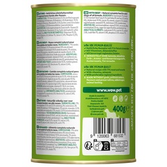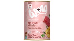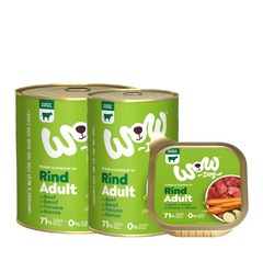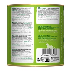 Adulto Vacuno con zanahorias | Composición: carne y vísceras 71 % (el 51,5 % de vacuno (pulmón de vacuno 31,5 %, riñón de vacuno 8 %, corazón de vacuno 6 %, hígado de vacuno 6 %), carne de pollo 19,5 %), zanahorias 2 %, minerales, calabacín 0,5 %, aceite de lino, cáscara de huevo molida, algas marinas 0,1 %, hojas de ortiga, hojas de diente de león. | Sin gluten, azúcares añadidos, soja, harina de huesos, despojos, colorantes, aromatizantes, conservantes, potenciadores del sabor. | Elaborado sin experimentación animal ni manipulación genética.