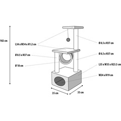 Material: felpa suave (200 g/m²) | Poste rascador con cuerda para rascador de sisal (4 mm) | Diámetro poste rascador: 8,5 cm | Túnel, plataformas de descanso y refugio | Con juguete para que disfruten jugando