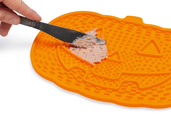 Alfombrilla para lamer de Halloween de Beeztees, con forma de calabaza y forma de perro, de silicona, color naranja Deja que tu perro coma con estilo en Halloween con esta alfombrilla para lamer de Beeztees. Puedes extender su comida o snack favorito sobre ella. Gracias a su diseño de silicona, la comida o snack se acumulará en los huecos, lo que dificulta que tu perro lama la comida, así que cómela. Lamer la alfombrilla ayuda a evitar que tu perro engulla la comida. Además, la alfombrilla también proporciona distracción en momentos de estrés, ya que tu perro estará concentrado durante más tiempo. Además, contribuye a su estimulación mental. La alfombrilla para lamer es fácil de limpiar, ya que es apta para lavavajillas. Para evitar que se deslice, se han añadido ventosas