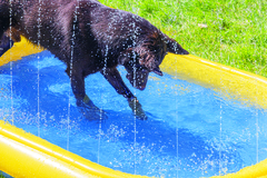 La piscina Palmera no sólo queda genial con la palmera en el lateral, sino que también proporciona a su perro frescor durante las temperaturas tropicales. Esta piscina no es tan profunda lo que permite al perro refrescarse las patas o tumbarse en ella. Hay aspersores en el borde de la piscina. Una vez conectada la manguera de jardín a la piscina, salen chorros de agua del borde de la piscina. Esto proporciona un enfriamiento adicional y diversión.