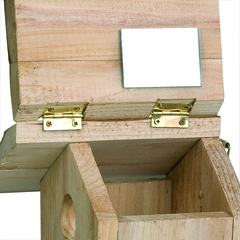 Material: madera de pino | Adecuado para aves de exterior como el herrerillo común, el jilguero lúgano o el chochín común | Resistente a la intemperie | Diámetro del orificio de entrada: 23 mm | Percha: 30 x 7 mm | Techo abatible para facilitar la limpieza, con espejo en el interior | Con plataforma de aterrizaje y gancho (de metal) y orificio para colgar