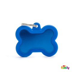 Chapa de aluminio anodizado y borde de goma, con opción de grabado por las dos caras. Incluye la anilla para colgar en el collar. Medidas: 3,3cm x 4,1cm. Grosor: 2mm | Equivalencia códigos: MF74250 = HTA01BLUE