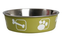 Comedero de acero inoxidable con un motivo moderno de pata y hueso | Disponible en diferentes tamaños y colores | Anillo de goma antideslizante extraíble | Apto para lavavajillas | Cuidado fácil
