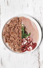COMPOSICIÓN: pollo 71 % (carne 34 %, corazónes 27 %, hígado 10 %), minerales, aceite de cardo, cáscara de huevo molida, algas marinas. | ADITIVOS/KG: aditivos nutricionales: vitamina D3 391 UI, cinc (como sulfato de cinc, monohidrato) 20 mg, cobre (como sulfato de cobre (II), pentahidrato) 1 mg. | Calidad alimentaria al 100 | 71 % de carne | Para perros de todas las edades | Mejor mezclado con Bio Greens o Bio Reds | Fabricado en Austria con materias primas preferentemente regionales | Contiene vitaminas, minerales y oligoelementos | SIN: Gluten, cereales, azúcares añadidos, soja, harina de huesos, despojos, colorantes ni conservantes | Elaborado sin experimentación animal ni manipulación genética.