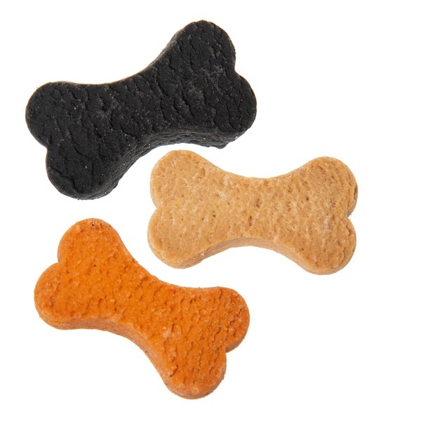 Galletas de masa quebrada con forma de hueso envasadas en una bolsa transparente y una caja.