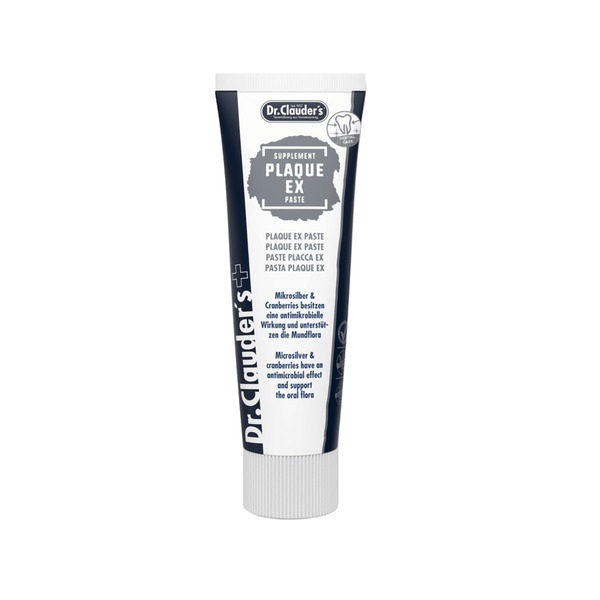 Cuidado dental eficaz sin cepillo de dientes Dientes sanos sin estrés: con la Pasta Plaque Ex de Dr. Clauder’s, se ofrece un cuidado dental altamente eficaz y fácil de usar para perros y gatos. La innovadora fórmula, con concentrado de arándano en alta dosis y microsilver antibacteriano, ha sido científicamente probada y actúa sobre las causas de la placa dental y el mal aliento. El microsilver posee propiedades antibacterianas y puede inhibir eficazmente la formación de bacterias y hongos en la boca, creando una barrera protectora duradera sobre las encías y los dientes. El extracto de arándano ayuda de manera natural a controlar la placa, dificultando que las bacterias se adhieran y reduciendo así la formación de nuevo sarro. La aplicación es especialmente sencilla: solo hay que administrarla directamente en la boca después de la comida o dejar que se laman de un plato – no se requiere cepillado de dientes.