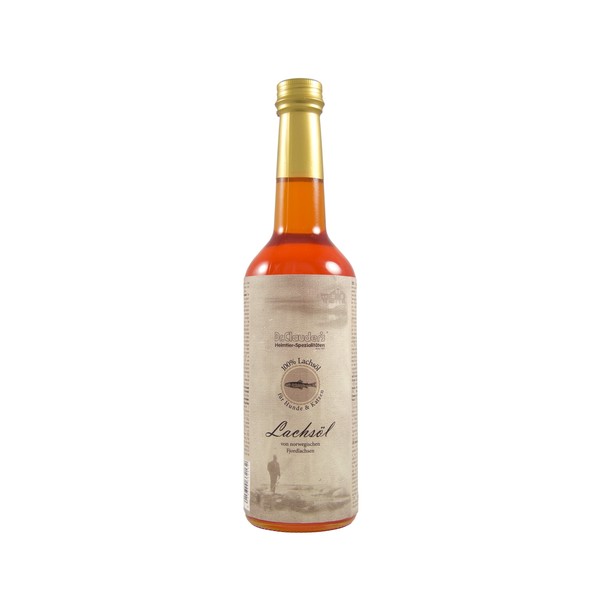 Composición : Aceite de salmón 100% natural.Componentes analíticos : grasa bruta 99%.Consejos de alimentación : Dosis: peso corporal/ml por día (1 cucharadita = aprox. 5 ml): hasta 5 kg: 2,5 ml; 5-15 kg: 5 ml; 15-30 kg: 10 ml; más de 30kg: 15ml. Comience con aproximadamente el 30% de la dosis diaria. dentro de 1 a 2 semanas, aumente a la cantidad diaria completa.Sugerencia de administración : agregar al feed o regalar por separado. ¡Agítese bien antes de cada uso!