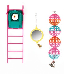 Proporciona a las aves una variada actividad y entretenimiento. diferentes formas como escaleras, espejos y pelotas . Entrega ordenada por color
